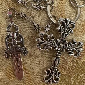 Elegant silver chain with cross and dagger charms. Intricate design. Perfect for adding a bold statement.