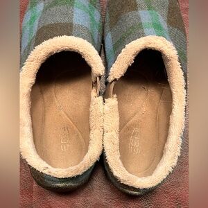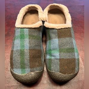 KEEN Women’s Howser Slide Shoe, size 8. Very good used condition. Blue/green plaid recycled wool upper with fleece lining and rubber soles. Slip-on style, good for indoor or outdoor use.