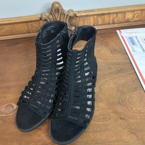 Elevate your style with these Wonder Nation black heeled boots, featuring a sleek strappy design that adds a touch of sophistication. Crafted for comfort and elegance, these boots are perfect for any occasion where you want to make a statement. The intricate strap pattern offers a modern twist on a classic look, ensuring you stand out with every step.