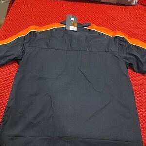 Casual black shirt featuring bold orange stripes. Ideal for everyday wear. Classic button-down style. brand new with tags