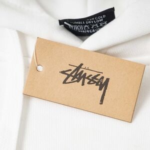 White hoodie featuring a bold red dice graphic and Stussy logo. Perfect for casual wear.