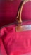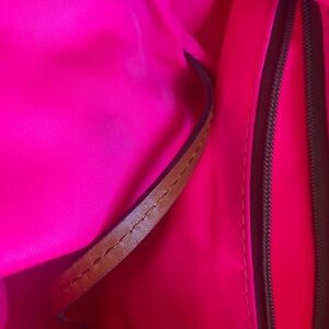 This Dooney & Bourke is a fun nylon red with leather handles. She’s worn noticeably a few spots on front and back, only one in the interior, not the original crossbody strap, added a new leather adjustable crossbody strap in dark brown matches color of zipper on top. She’s great for everyday and all weather with the nylon.