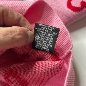 Super soft and cozy cardigan. LIKE NEW! Pink with red heart print. Fuzzy red heart buttons. Whether you are a lover girl or a queen of hearts, it's a fun sweater to add to any outfit. Deep v-neckline. Thick and soft textile.