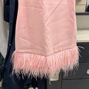 Chic pink mini dress with a feather hem. Perfect for a night out. New. Size 6