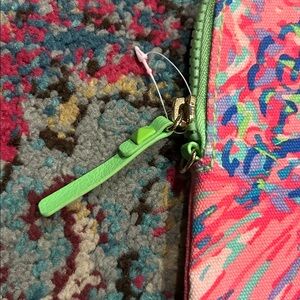 Lilly Pulitzer Bohemian Beach Sun Your Buns Large Wristlet/cosmetics Pouch. Predominately Hot Pink and lime green. Gold “Sun Your Buns” screen print on bottom of pouch. Canvas and faux leather. Gold tone hardware. Perfect as a makeup/toiletry bag, or wet bathing suit Pouch to take on vacation.