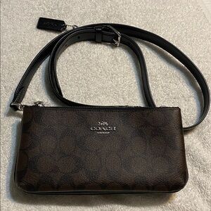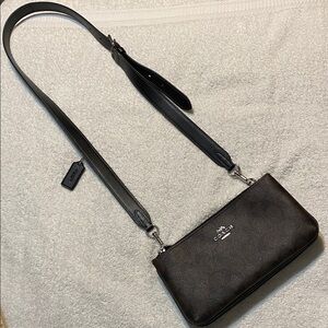 Sleek Coach crossbody bag in dark brown and black. Features a stylish design with a comfortable strap.