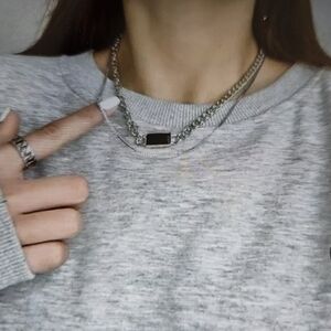 Elegant silver chain necklaces featuring a striking black pendant with one them. Perfect for adding a touch of sophistication to any outfit.