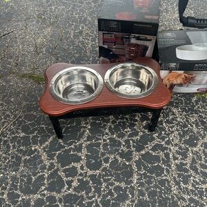 Elevate your pet's dining experience with this stylish feeding station. Features two stainless steel bowls and a wooden stand. Perfect for cats or dogs.