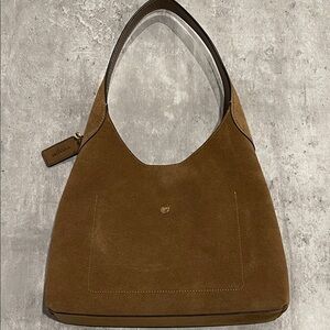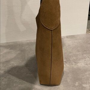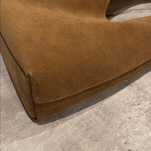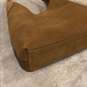 Suede and grain leather Inside snap pocket Magnetic snap closure Handle with 10 1/2 drop 11 (L) x 11 (H) x 3 1/4 (W) Style No. CW637. Comes with dust bag like brand new only used once. Beautiful suede in a great everyday bag.