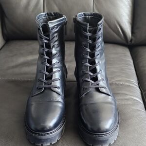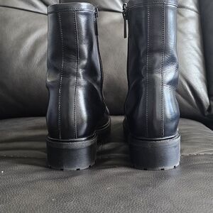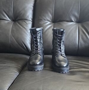 Sleek black leather combat boots. Durable and stylish. Perfect for versatile wear. Includes original box and dust bag. Just too small for me. These run small, they say 10 but do not fit a 10 so I posted as 9.5 womens. Narrow fit. I purchased them from Thursday Boot Company online Christmas 2025 and wore them hoping they would work out.