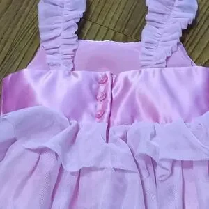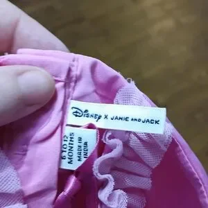 Adorable Disney x Janie and Jack baby girl princess dress in soft pink satin with layered tulle skirt and ruffle shoulder straps. Features button-back closure and includes matching pink bloomers. Perfect for baby girl special occasions, birthdays, photoshoots, holidays, dress-up, or Disney fans.