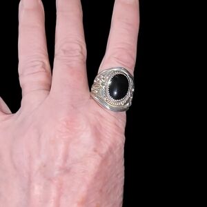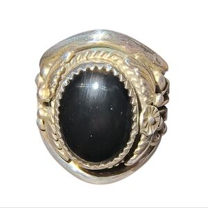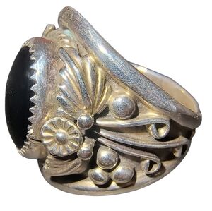 Substantial Native American ring in sterling silver, set with an oval black onyx in a sawtooth bezel. The stone is framed by detailed silverwork including leaves, tendrils, and bead accents. Wide, heavy band with rope-style detailing on the interior palm side. Hallmarked “Sterling” with maker’s mark “L.” A bold, Southwest-style statement ring with excellent weight and presence.
