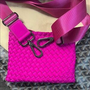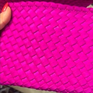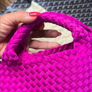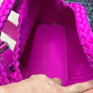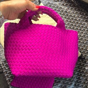 The Naghedi Pink Tote showcases a vibrant woven design, perfect for adding a pop of color to your ensemble. Its structured build and intricate basketweave pattern offer both durability and style, making it an ideal accessory for any occasion.