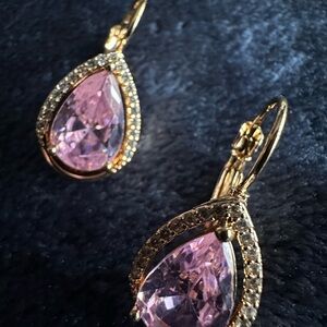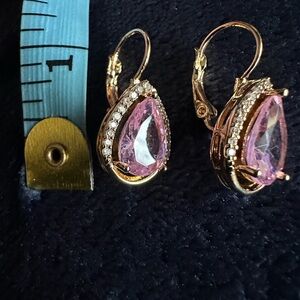 These stunning teardrop earrings feature a beautiful pink stone surrounded by a gold setting. Perfect for adding a touch of elegance to any outfit.