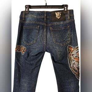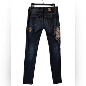 Dark blue skinny jeans with bold embroidery. Eye-catching design by Philipp Plein.