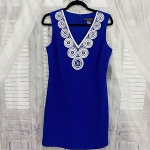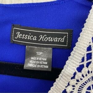 Jessica Howard Size 10 Petite Blue White Crochet-Trim Dress Sleeveless V Neck