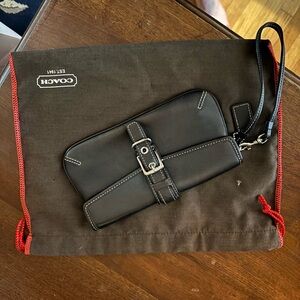 Sleek vintage black leather wristlet featuring a silver buckle. Perfect for any occasion.