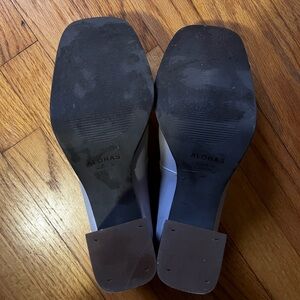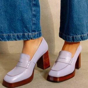 High heel/platform loafers. Mauve/lavender. They are more purple-y than pictured. Excellent used condition. Just don’t reach from them. Size 38, about a 7.5/8. I’m a 7/7.5 and they fit great—the footbed is more narrow.