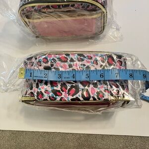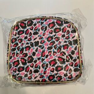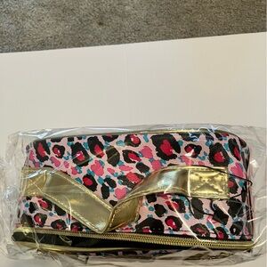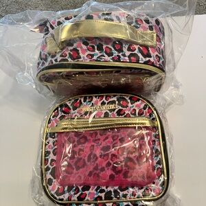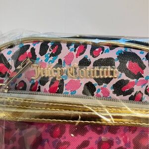 Juicy Couture Cosmetic Train Case and Organizer. Pink Blue and Black Leopard Pattern with Gold Trim and zippers. Also has small removable pink zipper pouch. NWT. Is much larger than I imagined. Top handle is creased on all of them from shipping. Bought several to give as gifts. I have 5 available. Bundle for a discount.