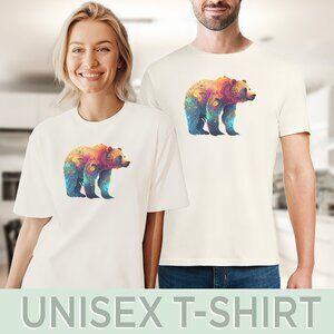 Imagine a forest where colors explode and a magnificent bear emerges, painted with the hues of a sunset and the glow of a hidden aurora. This shirt captures that magic, bringing a playful and majestic spirit to your everyday style.
