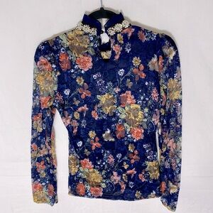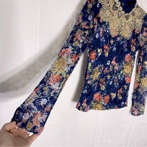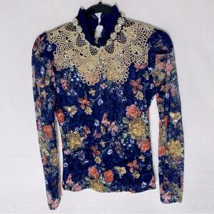 Vintage Y2K Floral Lace Embellished Long Sleeve Mock Neck Top XS