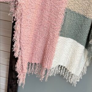Chic patchwork design with fringe details. Soft and cozy texture. Perfect for casual wear. Oversized PTP 28 will fit large.