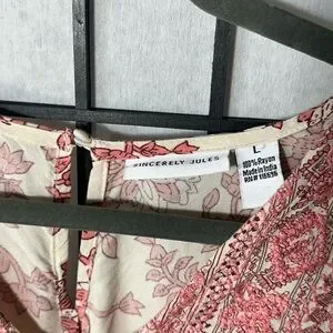 This Sincerely Jules Pink Babydoll Dress in size Large features long balloon sleeves with embroidered floral accents, a bohemian style perfect for travel, parties, or casual wear in winter, fall, or spring seasons. Made of rayon material, it has a knee-length dress with a layered design, creating a unique and handmade look.