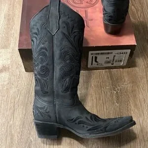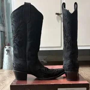Chic black boots with intricate embroidery. Stylish and versatile for any outfit.