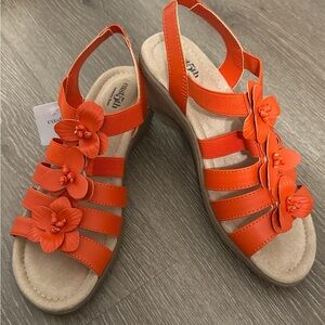 Vibrant orange sandals with floral embellishments. Perfect for adding a pop of color.