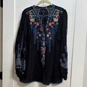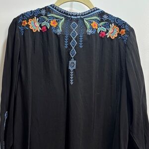 Johnny Was Black lightweight Blouse with Multicolor Embroidery XL tie at neck