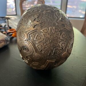 Enhance your space with this Aztec-inspired bronze skull sculpture. Its captivating bronze finish adds a touch of elegance and intrigue to any room. 7x8inches