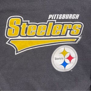 Vintage Starter Pittsburgh Steelers crewneck sweatshirt, Made in USA. Classic front logo + Starter sleeve tag. Black has an even fade to a charcoal/grey. Light crackle on part of the graphic.