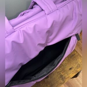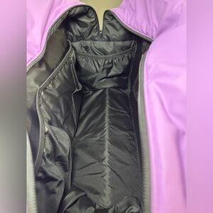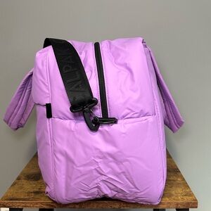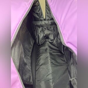 Multiple pockets, interior shoe compartment, trolley pass, lightweight, and very spacious. Comes with crossbody strap.