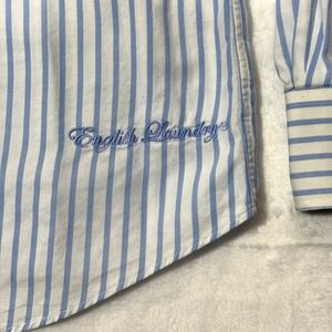Men's dress shirt by English Laundry, featuring a light blue and white striped pattern. Button-down design with distinctive details like patterned fabric inside the collar and cuffs, embroidered English Laundry logo near the bottom hem, and a small Union Jack flag patch on the side hem.