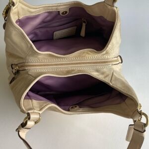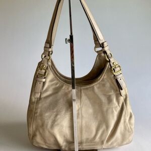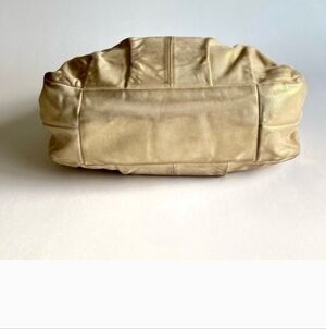Chic Coach shoulder bag in metallic gold. Perfect for elevating any outfit.Coach Gold Silver Canvas Beige Leather Shoulder Bag.