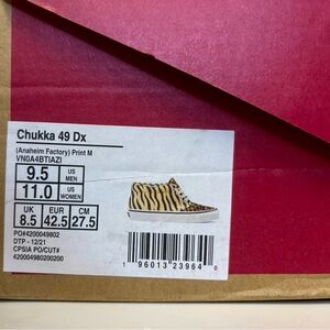 Vans Chukkas with striking animal print patterns: leopard, zebra, and giraffe. New with tags and box. Labeled Anaheim Factory Print M
