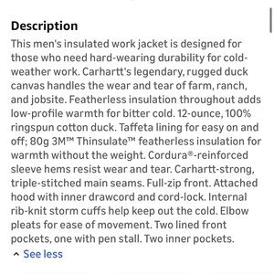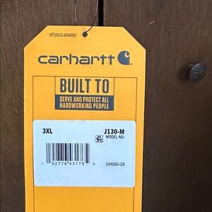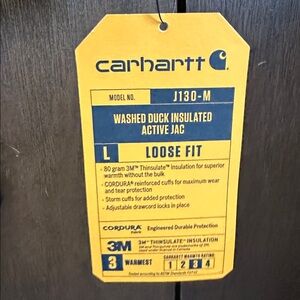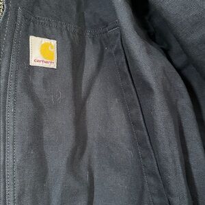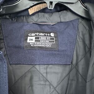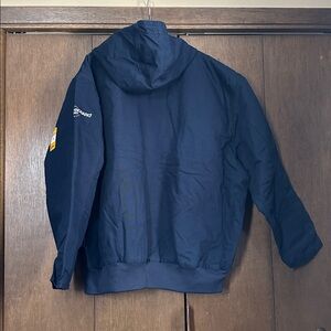 Durable Carhartt jacket in Navy. Features a hood and zip closure. Embroidered details on chest and sleeve. New with tags.