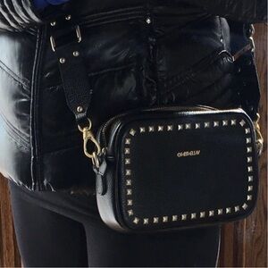 Leather crossbody bag accented with rock studs and logo detail, offering a stylish and edgy look. It features a top zip closure with gold-tone hardware and gold-tone accents, and includes two inside compartments. The bag is in good condition with no odor, well cared for, some fading on the gold hardware, all studs intact, and no wear on the corners.