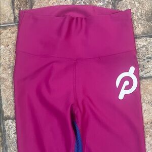 Bold fuchsia leggings with a sky blue side stripe. Peloton logo on the hip. 26 inseam.