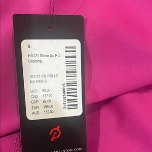Elevate your activewear game with these Peloton Show Up leggings. These cropped, high-waisted, ribbed leggings in a striking pink color are perfect for cycling, cross-training, CrossFit, and bodybuilding. The solid pattern with the Peloton logo adds a touch of style to your workout.