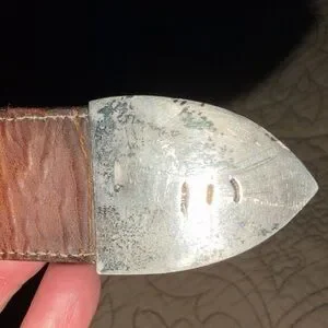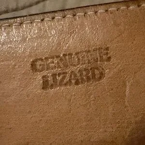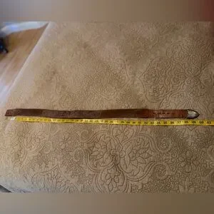 Brown leather western belt with lizard ends from Tony Lama. The belt comes without a buckle, but has the silver tip. This is a vintage piece that has seen a lot of wear, but as with all Tony Lama products, the quality is still there. It is marked a 36, but depending on the desired sized, this beautiful belt could work for a woman as well as a man.