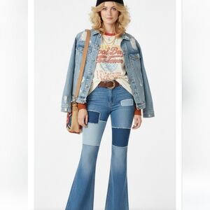Elevate your style with these chic denim patchwork flare jeans. Featuring a blend of blue tones, they offer a fashionable and comfortable fit.