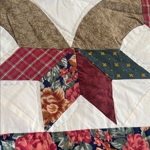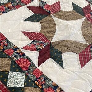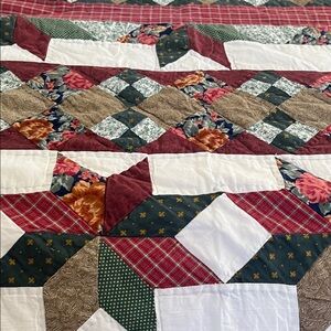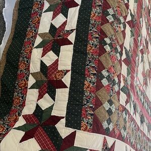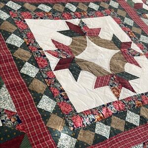 Beautiful handmade vintage quilt featuring a bold STAR Block pattern in rich burgundy, forest green, cream and earthy neutrals. This stunning quilt has strong symmetry, detailed piecing and a classic aesthetic that works in most decor.