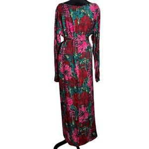 Vibrant floral silk-blend maxi dress featuring rich red, pink, and green tones with a removable tie belt, back zip and elegant long sleeves. Made from luxe silk twill with a soft sheen and beautiful drape — the perfect statement piece for weddings, vacations, or spring events.