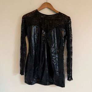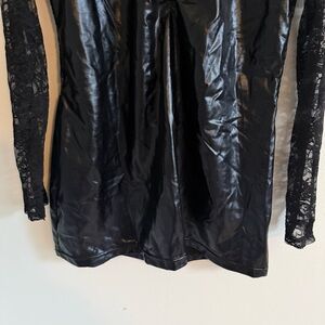 Black lace bodycon dress featuring lace long sleeves.