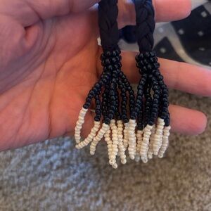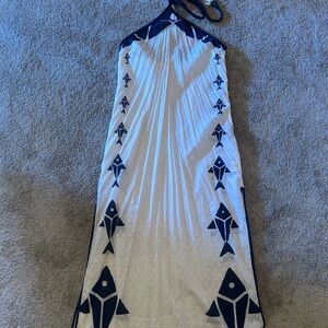 Elegant swim cover up with a geometric pattern. Features white and navy colors and beaded tassels. Halter neck. New with tags.