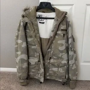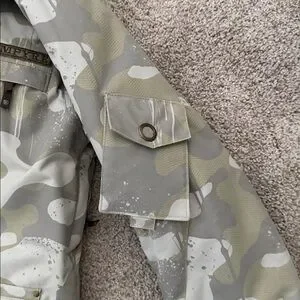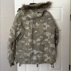 Stylish camouflage jacket with a cozy removable hood. Perfect for any outdoor adventures.