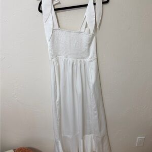 This tie strap white midi dress is filled with charm! Similar to our bestselling claire midi but with adjustable tie straps. A fitted bodice complete with smocking for the perfect fit meets a fun midi skirt with side slit. An effortless midi dress for all your bridal events!
