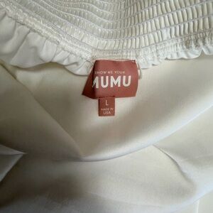 Show Me Your Mumu Garden Midi Dress in Ivory Luxe Satin. Size large, runs small and fits more like a medium. Worn once for my bridal shower and dry cleaned after; this dress is ready for the next bride!