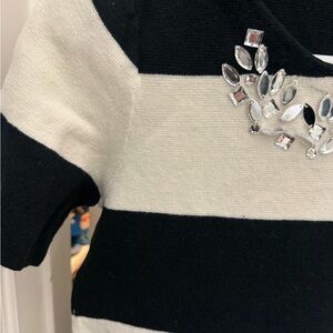 Elegant short sleeve tee with bold black and white stripes. Features sparkling silver embellishments at the neckline.